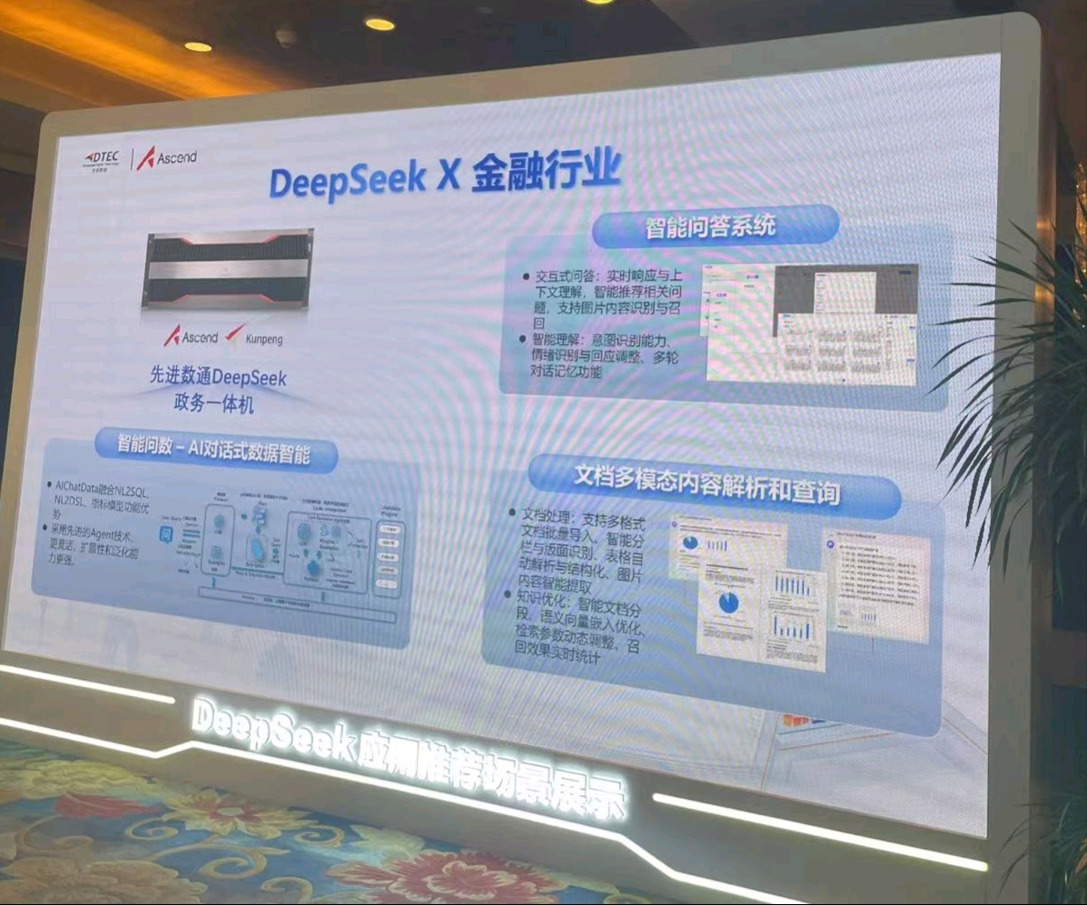 本次大会天盛优配展示了DeepSeek一体机,向业界全方位展示了其在金融科技领域的创新实力。天盛优配DeepSeek一体机的文档多模态内容解析和查询功能备受瞩目。它能够对各类金融文档,如研究报告、监管文件、交易记录等进行全方位解析,将文本、图表、图像等多模态信息转化为可高效查询和分析的结构化数据。金融组织借此可快速定位关键信息、洞察市场趋势、防范合规风险,为决策给予有力支持,实现从数据到价值的高效转化。